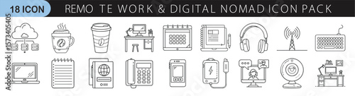 Remote Work Icon Set – Line Style Vector for Freelance, Home Office, and Online Collaboration, team work, stayhome, online work, home office, network.