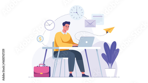 Work-from-Home Productivity — Person at Desk Using Laptop with Clock, Paper Plane, Coin, Envelope, and Briefcase Illustrating Remote Workflow