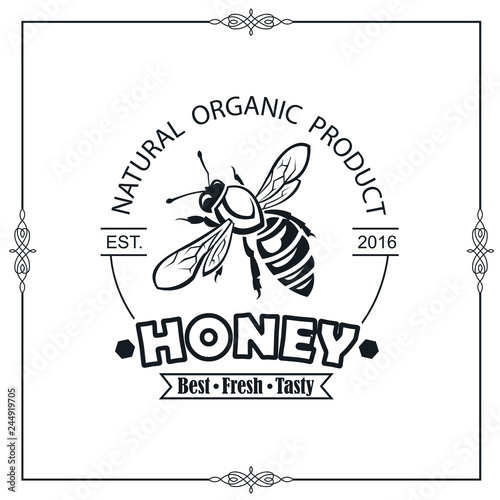 Vintage bee logo design. Honeycombs and wasp, retro new honey harvest sticker. Rural agriculture market vector badge