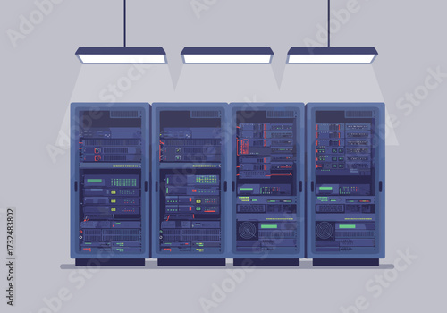Server room with racks, equipment, cabinets, computer hardware cluster for digital information storage. Internet hosting, network, telecommunication technology system. Flat vector illustration
