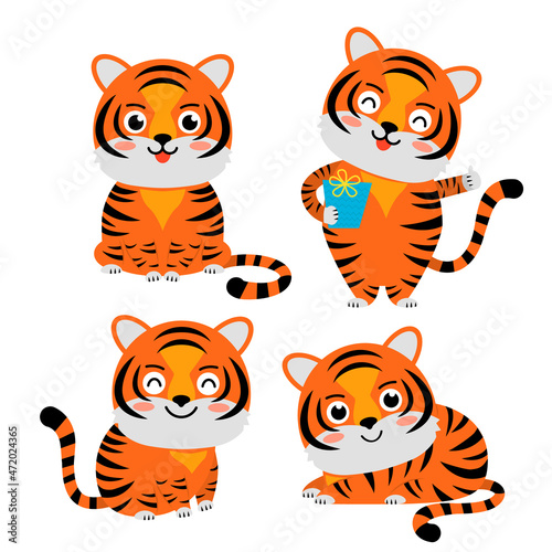 set of cute tiger cubs dressed as Santa Claus. The year 2022 of the tiger is a symbol of the new year in the Chinese calendar.