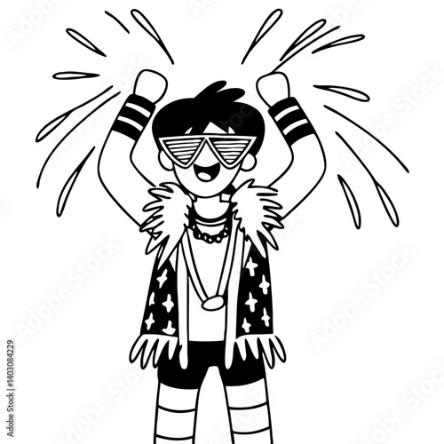 Simple stick figure illustration of a person jumping with joy surrounded by colorful shapes and stars.
