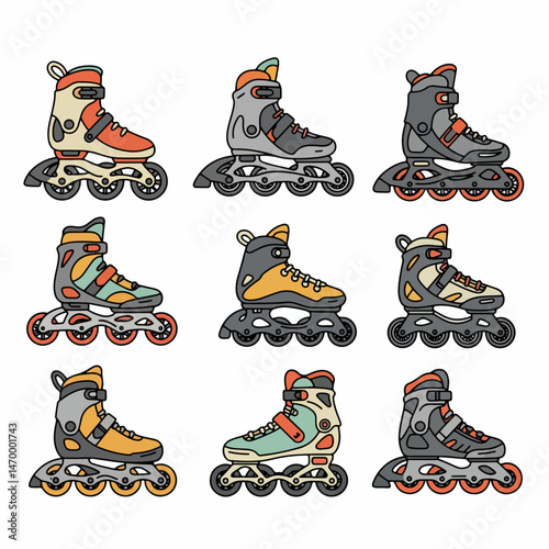 Set of various roller skates and inline skates in black outline graphic style