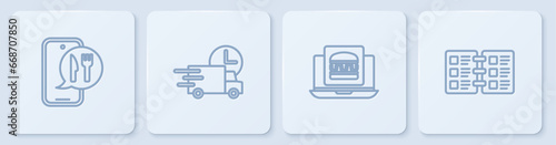 Set line Online ordering and delivery, burger, Fast by car and Restaurant cafe menu. White square button. Vector