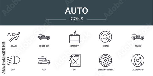 set of 10 outline web auto icons such as chair, sport car, battery, break, truck, light, van vector icons for report, presentation, diagram, web design, mobile app
