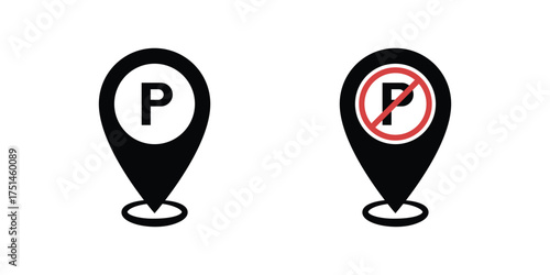 Parking available and not available sign collection with location pin icons, navigation markers, urban city transportation symbols, car parking direction, vector road guide illustration