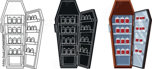 Coffin refrigerator vector illustration filled with blood bags available in color black and white and outline versions perfect for Halloween themes