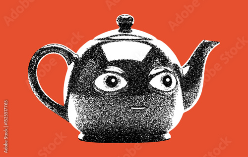 Christmas ceramic teapot with tree. Cute tea kettle in retro style. Hand drawn kitchen crockery. Graphic textured teakettle isolated element. Vector flat holiday illustration.