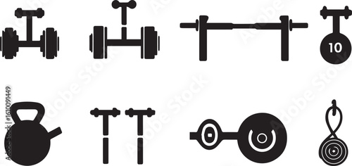 Fitness equipment icons in minimalist silhouette style for gym and exercise themes