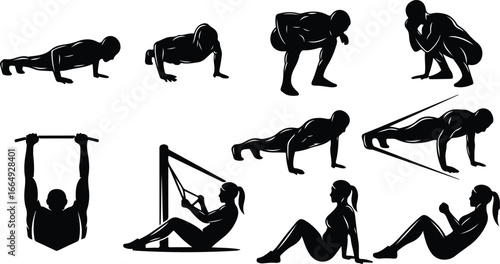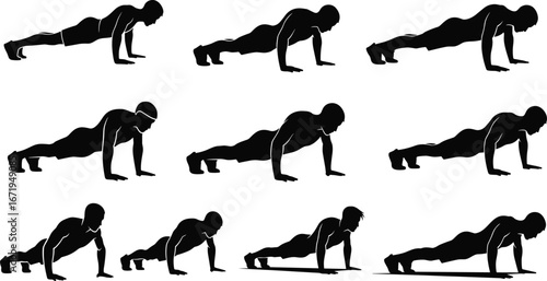 Push up exercise silhouette vector collection showing male and female workout positions, fitness training poses, and gym body strength exercise illustration design