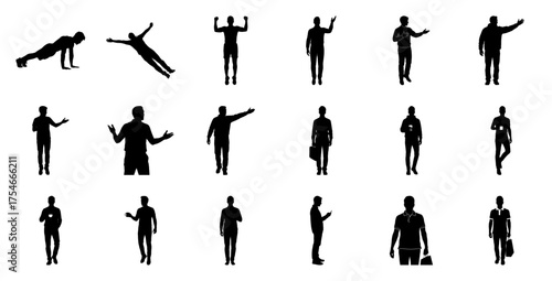 Men silhouette vector set, businessman success poses, fitness workout, magician performing, walking and sitting, diverse male characters collection, isolated on white background