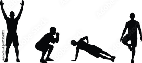 Male and female workout silhouette, yoga poses, bodyweight exercises, fitness routine, stretching, meditation, core training, squat, pushup, plank