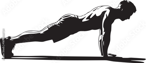 Man doing a push-up or plank exercise in a minimalist black silhouette illustration representing fitness and strength.