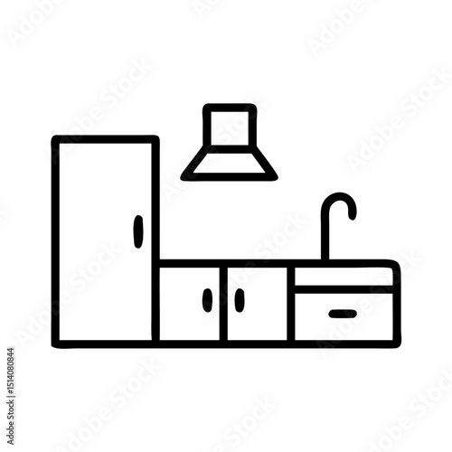 Black outline vector icon of a modern kitchen setup with cabinets, refrigerator, stove, and sink for home design and culinary concepts.