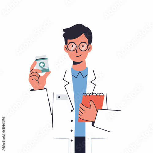 A young male pharmacist in a white coat holds a medicine bottle and a clipboard in front of shelves stocked with pharmaceuticals.
