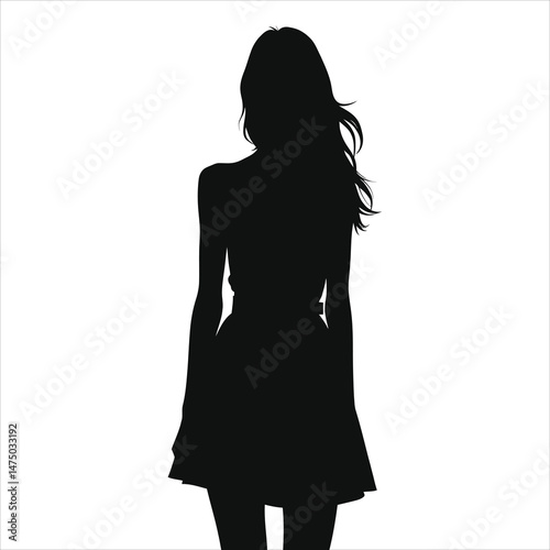 (Peep-toe heels) Elegant female vector silhouette in a short dress against a white background/A stylish black silhouette of a woman in a short dress, standing with her hand on her hip.