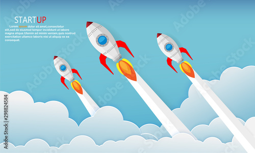 Paper art of rocket illustration flying over cloud. beautiful scenery with white clouds, vector art and illustration.