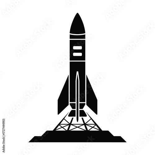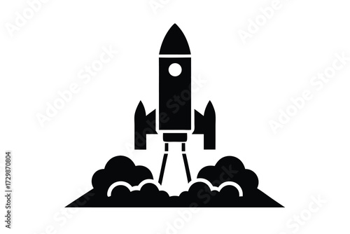Minimalist black and white vector illustration of a rocket launching from a launchpad, ideal for technology and space-themed projects