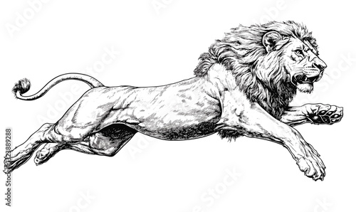 A detailed black and white illustration of a leaping hare in a dynamic pose isolated on white background silhouette