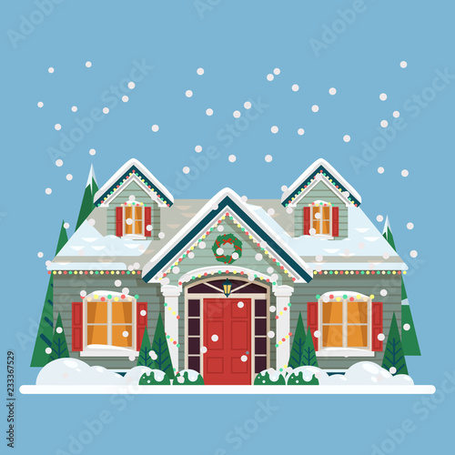 Christmas winter house facade exterior. Isolated vector cottage adorned with twinkling lights, wreath and a snow-draped roof. Cozy windows welcoming the festive spirit with a touch of seasonal magic