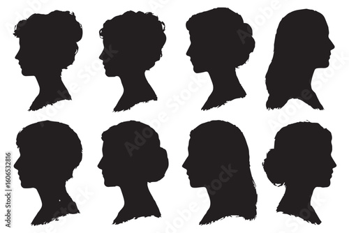 Sunglasses fashion silhouettes, diverse styles, eyewear icons, hairstyle contrast, black design, vector illustration, trendy looks, personal style