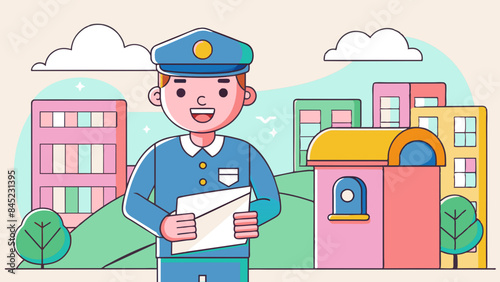 Mail Carrier's Warm Welcome: A charming illustration of a mail carrier in uniform waving hello, rendered in vibrant colors, exuding friendliness and approachability.