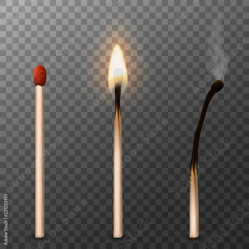 Progression of a matchstick showing unlit, ignited flame, burnt out, and smoking stages