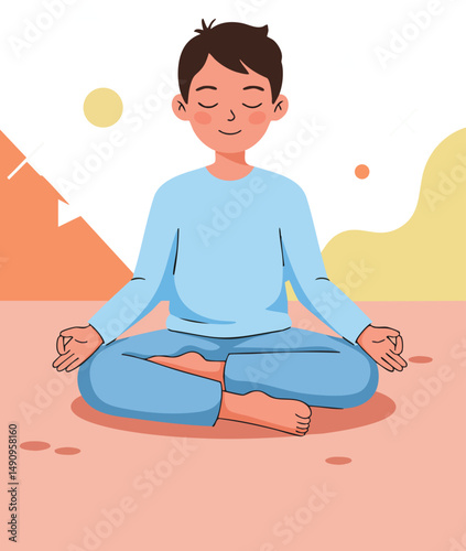 Collection of people sitting with crossed legs on floor and performing yoga breathing exercise. Girls and boys with closed eyes practicing Pranayama. Colorful vector illustration in flat cartoon style