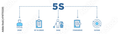 5s banner for lean manufacturing methodology of cleaning organization system with sort, set in order, shine, standardize, and sustain icon