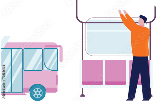 Taxi driver inviting passenger get into Minibus taxi. Van car driver service. Cab Company Business. Welcome hand gesture. Vector illustration, flat design, cartoon style. Isolated background