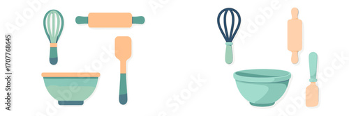 Baking tools and kitchen utensils for pastry preparation including whisk, rolling pin, mixing bowl, and piping bag