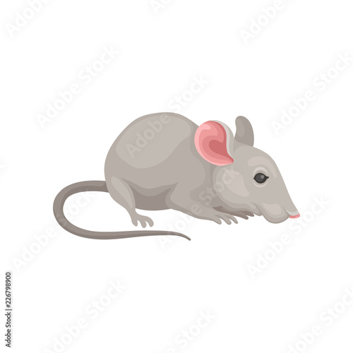 Cute comic mouse near hole in wall vector illustration. Cartoon drawing of adorable grey rodent character sitting isolated on white background. Nature, pets, domestic animals concept