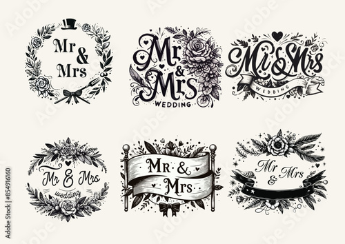 Mr and Mrs. Modern brush pen lettering. Wedding template. Bride and groom card. Vector illustration.