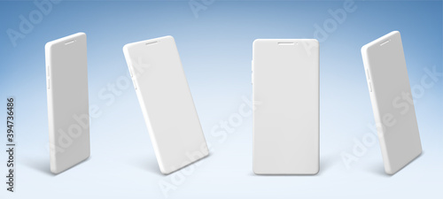White smartphone mockup. 3D clay mobile template isolated in perspective view. Realistic white phone set with blank screen for show your user interface app design, media or promo, vector illustration.