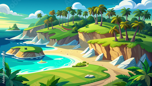 A lush, tropical golf course situated on a rocky peninsula surrounded by turquoise waters and sandy beaches. The course features rolling green fairways and bunkers carved into the natural landscape