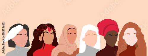 International Women's Day banner. 8 March concept. Girls of different nationalities with flowers in their hair. Vector illustration.