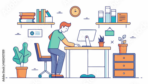 confident professional vector with disability using wheelchair in modern office, working independently with laptop, symbolizing diversity, empowerment, and inclusion in workplace