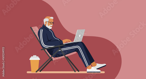 Modern senior man in a tracksuit comfortably working on a laptop while relaxing in a chair with coffee. Represents active retirement, remote work, and digital lifestyle.