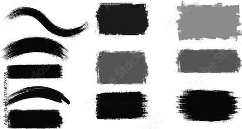 Set of nine bold black abstract brush stroke shapes and ink splatters, isolated on a clean