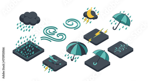 Weather silhouette icons: rain gear and storm symbols for seasonal designs