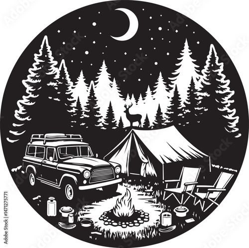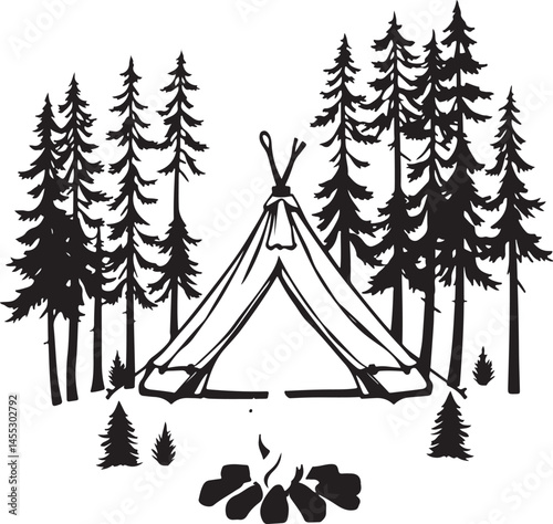 Simple Travel Logo Camping: Black & White Line Art, Camper, Fire Pit, Minimalist Elements, Clean Vector Graphic Design