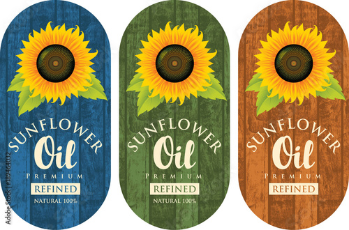 Vector banner or label for sunflower oil with sunflower and calligraphy handwritten inscription on blue gradient background