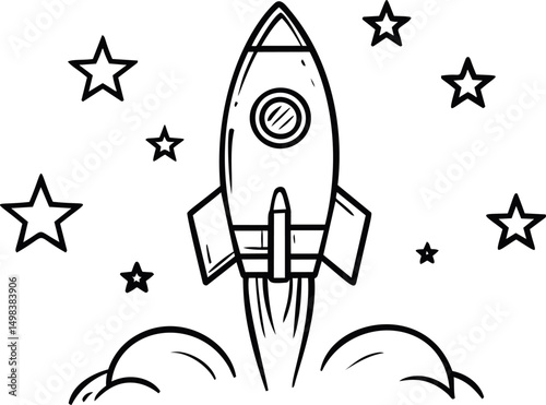 A black and white retro sketch style graphic features a collection of space-themed icons, including a rocket, planet, astronaut helmet, star, and satellite, against a white background.