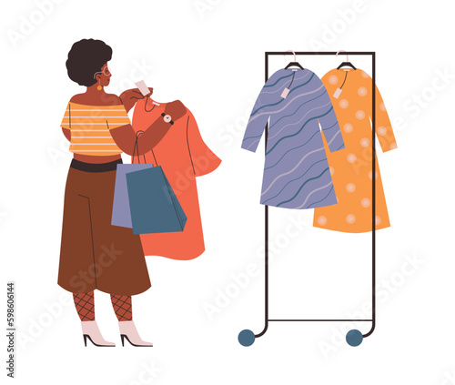 Young woman holding non recyclable plastic bag. Hand drawn style vector design illustrations.