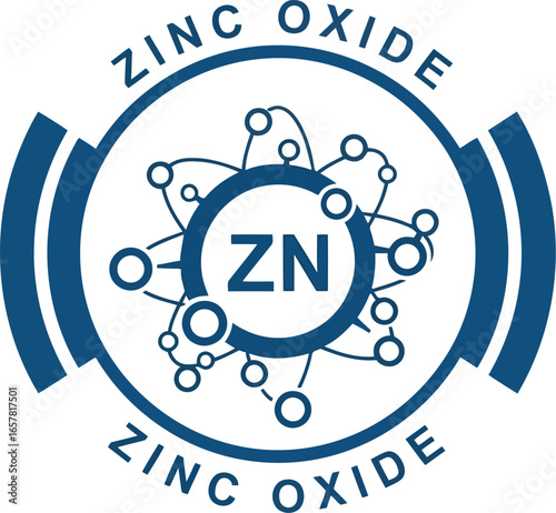 Circular emblem or badge featuring the chemical symbol for zinc oxide zn surrounded by bubbles and text indicating zinc oxide