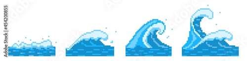 Pixelated sea and ocean waves. Blue tidal currents and powerful tsunami ridges. Stormy water shafts with process of spawning from small to waves of vector monsters