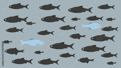 One unique fish swims opposite from identical blacks. Concept of courage, confidence, success, crowd and creativity.
