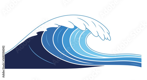 Stylized ocean wave illustration with blue gradients and white foam crest evoking a sense of power and movement in marine environment