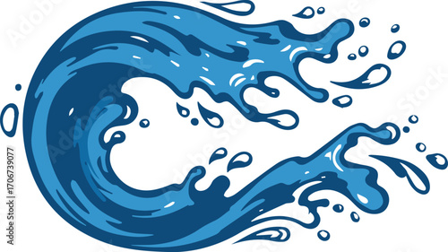 Cartoon illustration of a blue ocean wave with water droplets and bubbles, isolated on white.