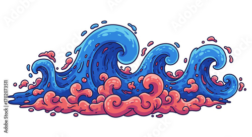 Stylized Blue Ocean Waves with Pink Foam Illustration.